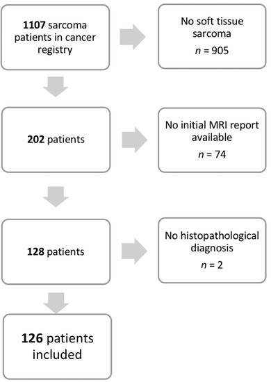 As a first step, patients with a definitive histopathological diagnosis of malignant soft-tissue sarcoma of the extremities were identified, excluding any subtypes of benign tumors, tumors with inconclusive histopathological results, and osseous sarcoma (n = 905). In some patient files, the initial MRI reports (n = 74) or final histopathological results (n = 2) could not be retrieved. Ultimately, 126 patients with complete initial MRI reports and final histopathological results were included in this study (Figure 1).
