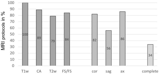 Percentage of European Society for Musculoskeletal Radiology (ESSR) recommended sequences and planes included in magnetic resonance imaging (MRI) protocols. T1w = T1-weighted; CA = use of contrast agent; T2w = T2-weighted; FS/FS = fluid-sensitive/fat-saturated sequence; cor = coronal plane; sag = sagittal plane; ax = axial plane; complete = all sequences/planes included.