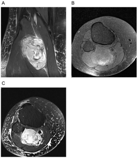 Initial MRI describing a suspected schwannoma; histology after resection confirmed malignant peripheral nerve sheath tumor (MPNST). (A) Coronal proton density (PD) sequence. (B) Axial fat-saturated T1 sequence without contrast agent. (C) Axial T2 sequence.