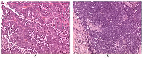 (A) Histologic appearance of classic high-grade serous carcinoma (HGSC) (hematoxylin and eosin, H&E, ×100); (B) Solid, pseudoendometrioid, transitional cell carcinoma-like (SET) variant of HGSC (hematoxylin and eosin, H&E, ×100).