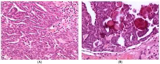 (A) Histologic appearance of low-grade serous carcinoma showing tumor cells with uniform nuclei and inconspicuous mitotic activity (hematoxylin and eosin, H&E, ×100); (B) Psammoma bodies are frequent in low-grade serous carcinoma (hematoxylin and eosin, H&E, ×100).