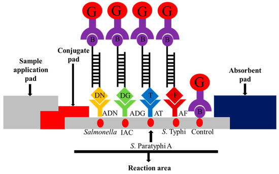 Schematic illustration of the principle of the multiplex PCR-lateral flow biosensor (mPCR-LFB) for the visualization of PCR amplicons using immobilized capture reagents on the nitrocellulose membrane. The target PCR amplicon for pan-Salmonella is dinitrophenyl and biotin labeled and is captured on the Salmonella reaction area; S. Paratyphi A is Texas red and biotin labeled and is captured on the S. Paratyphi A reaction area; S. Typhi is FITC and biotin labeled and is captured on the S. Typhi reaction area, and the internal amplification control (IAC) is digoxigenin and biotin labeled and is captured on the IAC reaction area. The accumulation of streptavidin-colloidal gold conjugate in the respective areas produced visible red dots. Excess streptavidin-colloidal gold conjugate is captured on the control reaction area for the validation of the lateral flow biosensor. G = streptavidin-colloidal gold conjugate; B = biotin; DN = dinitrophenyl; ADN = anti-dinitrophenyl; DG = digoxigenin; ADG = anti-digoxigenin; T = Texas red; AT = anti-Texas red; and F = FITC; AF = anti-FITC.