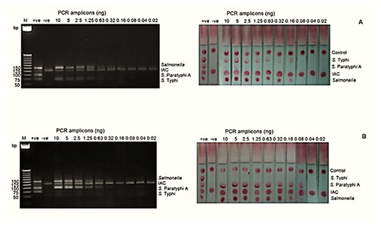 The analytical sensitivities at the DNA level for S. Typhi and S. Paratyphi A by mPCR-LFB were 0.16 ng and 0.08 ng, respectively, whereas mPCR-AGE showed that both serovars can be detected as low as 0.63 ng (Figure 2).