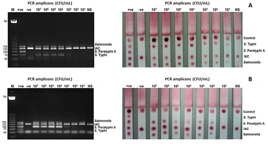 Colloidal gold nanoparticles were used in this lateral flow biosensor due to its high affinity and ease to be functionalized on biomolecules. The advantages of gold nanoparticles include good stability, high affinity towards biomolecules, environmentally friendly, and having an intense red color that can be easily detected by the naked eye or by a reader [38,39,40,41,42,43]. The mPCR-LFB detected and indirectly visualized the amplified product of S. Typhi or S. Paratyphi A by formation of red dots after 15 min of amplicons application onto the lateral flow strip. The biosensor was designed to allow both primers to be labeled instead of using a labeled probe, thus eliminating the need for the DNA strands to be denatured and single stranded DNA hybridized to the labeled probe.