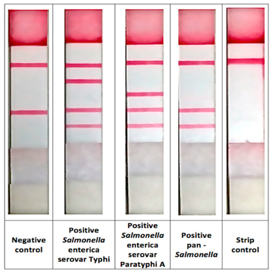 In terms of lateral flow assay development for diagnostics application, several studies were conducted for antibody detection for screening of typhoid and paratyphoid fever [24,25]. A very sensitive confirmatory test is via PCR. PCR has the advantage of adopting lateral flow assay for visualization for amplicons instead of agarose gel electrophoresis. Therefore, an alternative method for laboratory diagnosis of typhoidal and paratyphoidal Salmonella is by performing conventional PCR followed by detection by a lateral flow biosensor (LFB) device; this has comparable turnaround time as real-time PCR since the detection for lateral flow is done in 15–20 min [26]. LFB involves the immobilization of antibody on a solid surface, hybridization of labeled-PCR amplicons and detection by nanoparticles such as colloidal gold [27,28,29,30,31,32]. The detection method is rapid, user-friendly and the results can be observed by naked eye [29,32,33,34,35,36].