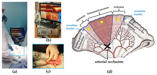 The procedure for intraoperative small intestine visualization using multimodal optical coherence tomography (MM OCT). (a) General overview of the trans-serous MM OCT study; (b) MM OCT system (1) with probe (2) and an example of data set acquired after tissue scanning (3); (c) the probe (2) in a sterile sheath is placed on the surface of the normal ileum; (d) diagram of the MM OCT study of ischemic bowel: square mark—point of the OCT probe localization on the anesthetized part of the intestine, round marks—points from which MM OCT images were obtained from the ischemic areas of the intestine to be resected.