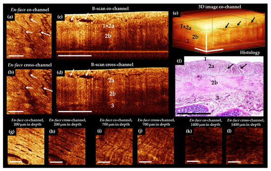 The results of comparison of OCT B-scans with histological samples revealed that in most cases, the intestinal wall was visualized in depth up to the submucosa. The serous membrane 40–100 µm thick—the first highly scattered layer—practically merges with the underlying muscle layer, but is marginally better distinguishable in the cross-channel (Figure 3d, number 1). A distinctive feature of the outer muscle layer (Figure 3c–e, number 2a) is its heterogeneity due to the presence of numerous slit-like spaces, which are clearly visible in the en-face images (Figure 3a,b, white arrows). They indicate the location and orientation of the muscle bundles (Figure 3f, black arrows). This layer is up to 400 µm thick. In the co- and cross-channel B-scans, the intermuscular spaces are contrastingly visualized as negative. Note that the separately located inclusions with a predominantly horizontal orientation (Figure 3c,d, arrows) are due to tissue compression by the probe, whereas, on the corresponding histological specimen, these slit spaces are located at different angles to the surface (Figure 3f, black arrows). The inner (circular) layer of muscle (Figure 3c–e, number 2b) is localized at depth 450–1100 µm, with the zone of transition of the outer muscle layer to the inner one being better defined in the B-scans cross-channel (Figure 3d). This is due to a local increase in the OCT signal intensity and the change of direction of the muscle fibers. The change of direction of the muscle fibers between the different muscle layers (see Figure 3g–j) can be used during the search for blood vessels or layer transition. In some cases, submucosa and very rarely part of the mucous membrane (muscularis mucosa and the adjacent to it lamina propria, Figure 3k,l) were visualized. It is possible to visualize in cases of naturally reduced thickness of the muscle and submucosal layers. For example, when the intestinal wall is stretched by a gas bubble located in the lumen of an organ.