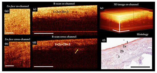Representative trans-serosal CP OCT images of ischemic ileum without necrosis. (a,d) In the B-scans co–c) and cross–(d) channels and in 3D OCT image (e) the general architecture of the serous membrane (1) and muscularis externa (outer longitudinal—2a and inner circular—2b layer of smooth muscle) are clearly resolved with the extensive accumulation of intermuscular fluid (white and black arrows) within each layer. The boundary between the circular muscular layer (2b) and the submucosa (3) is more clearly visible in the B-scan cross—image (d). (a,b) En-face OCT images at the level of the longitudinal muscular layer (green horizontal line in (e)), intermuscular spaces (white arrows) are longer and wider than in norm (Figure 3a,b). (f) Corresponding histological image, H&E staining. Black arrows indicate intermuscular edema. Scale bars 1 mm.