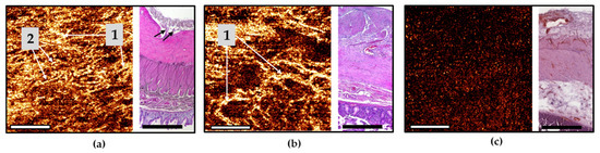 In the B-scans co-polarization channels, as a rule, the serous and muscularis propria are characterized by a high degree of scattering, the intensity of which decreases with depth (Figure 2c, numbers 1,2a,2b). Vertical heterogeneity is created by shadows from the blood vessels of the serous and muscle layers. The vessels themselves are almost indistinguishable on the structural images due to insufficient contrast with the surrounding tissues. The submucosal layer is perfectly visible due to the presence of connective tissue (Figure 2g, number 3) and muscularis mucosa (Figure 2g, number 4, yellow arrow), being visualized as two horizontal stripes (Figure 2c,d, numbers 3 and 4, yellow arrow). Large and small blood and lymphatic (Figure 2c,d, blue arrows) vessels are located in submucosa. It has been established that the cross-polarization image (Figure 2e) provides more information about the layers of the intestinal wall, allowing separate detection of the serosa (Figure 2e, number 1) and the two muscular layers. Note that the mutually perpendicular arrangement of the muscle layers and the dense parallel packing of the muscle bundles within them leads to polarization effects, as a result of which the outer muscle layer looks brighter than the inner one (Figure 2e, numbers 2 and 3). Similarly, the submucosa (Figure 2e, number 4) is clearly evident due to the sensitivity of polarization to the properties of the collagen fibers forming the connective tissue of this layer. In the en-face OCT images at the level of the outer muscle layer, single slit-like spaces are noticeable (Figure 2a,d, white arrows), which correspond to intermuscular spaces (Figure 2g, black arrow).