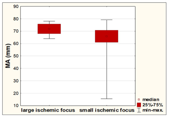 No significant correlations were found between thrombelastography values (R, K, angle (alpha), MA and Ly30) and the size of acute ischemic infarct in the entire group. We reported only a trend between MA and the volume of stroke (R = 0.36, p = 0.0583). Comparison between large and small ischemic infarcts is presented in Table 2.