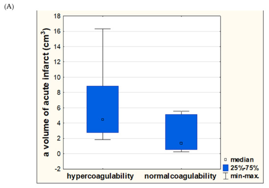 The processing device for measurement of coagulation processes was TEG® 5000 Thrombelastograph Hemostasis Analyzer (manufactured by Haemonetics Corp., Braintree, MA, USA). Reactions were carried out in test cells (called cups). The Kaolin TEG® was used for the study. The procedure was performed according to the manufacturer’s instructions. In brief: The whole blood samples were collected from forearm veins within the first 24 h after the onset of stroke. First, we add 1 mL of blood to the reagent container, close it and mix the contents. After we put 20 µL of calcium chloride into the cup, use a pipette to measure 340 µL of the previously prepared solution (blood and kaolin). Then the contents of the cup are set into an oscillating motion. Then a clot also forms. The electrical signal arises from the conversion of vibrations by transformer. The results are presented in a graphic form from which the following values can be read: Reaction time (R)—means the time until the first clot is detected; clots kinetics (K)—the time from the end of the test until the clot reaches 20 mm, which is the rate of clot formation; angle (alpha)—means the rate of fibrin deposition and cross-linking. The angle refers to K and measures the rate of clot growth and strengthening. Maximum Amplitude (MA)—is a reflection of the maximum strength and firmness of the clot; Lysis at 30 min (LY30)—is the percentage of lysed clot after 30 min. We set a limit value of MA over 69 mm as a marker of hypercoagulability, similarly to other studies [16,20]. All subjects with MA values below 69 mm were defined as normalcoagulable.