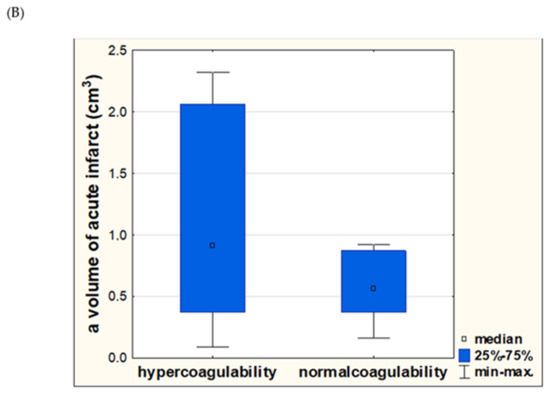 Differences in a volume of acute ischemic infarct (measured in cm3) between stroke subjects with hyper- or normalcoagulability, distinguished by maximal amplitude in thrombelastography. Significant difference was reported only in a large artery atherosclerosis subgroup (A). No significant differences were noted in a small-vessel subgroup (B).