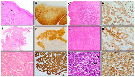 Diagnostic applications of p16 INK4a (BC42 clone) in different gynecological tumors. (A) Vulvar intraepithelial neoplasia (high-grade SIL/VIN 3) is characterized by full-thickness nuclear atypia and increased mitotic activity (arrows). (B) A continuous strong nuclear and cytoplasmic p16 staining across all epithelial layers is observed. (C) HPV-related invasive squamous cell carcinoma of the vulva showing diffuse and strong p16 (BC42) staining (D). (E) Cervical bioptic specimen showing high-grade dysplasia of the surface epithelium (arrow) confirmed by the strong nuclear and cytoplasmic staining for p16 (F). (G) HPV-related invasive squamous cell carcinoma of the uterine cervix showing diffuse and strong p16 (BC42) staining (H). (I) HPV-related invasive adenocarcinoma of the uterine cervix showing diffuse and strong p16 (BC42) staining (J). (K) Uterine spindle cell leiomyosarcoma is characterized by high-grade nuclear atypia and increased mitotic activity (arrows). (L) A strong nuclear and cytoplasmic p16 staining is observed.