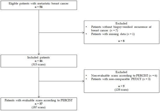 Patients with MBC were identified at the Department of Oncology at Odense University Hospital. A patient flowchart has been shown in Figure 1. A total of 187 scans in 37 patients were eligible for analysis after the exclusion of 128 non-comparable scans. The median age at MBC diagnosis was 62.3 (45.8–73.5) years, and the median time from primary breast cancer until the diagnosis of metastatic disease was 7.10 (1.56–18.8) years. Characteristics of the primary tumors and the verifying biopsy from metastatic lesions are shown in Table 1 and Table 2, respectively. In total, two patients were diagnosed with primary advanced disease and hence, no biopsy from a metastatic lesion was performed due to the standard of care in our institution.