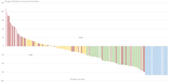 A waterfall plot with the percentage change in SULpeak in 150 follow-up scans compared with the baseline standardized uptake values normalized by lean body mass (SULpeak). In 37 cases new lesions were visualized by the dark-red color. In 12 cases, new lesions were visualized despite the favorable partial metabolic response category. Complete metabolic response indicated by blue bars was assessed visually. Response categories: PMD (light-red): PMD: progressive metabolic disease, SMD (yellow): stable metabolic disease, PMR (green): partial metabolic response, CMR (blue): complete metabolic response.