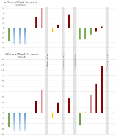 Illustration of the percentage change in standardized uptake values normalized by lean body mass (SULpeak) for one patient with 16 follow-up scans for (A) PERCIST response assessment compared with baseline and (B) PERCIST compared with the nadir level of SULpeak. New lesions were visualized by dark-red bars and change of treatment by shaded grey bars Response categories: PMD (light-red): Progressive metabolic disease, SMD (yellow): Stable metabolic disease, PMR (green): Partial metabolic response, CMR (blue): Complete metabolic response.