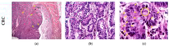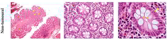 Tissue samples were stained with H&E and histologically inspected. Figure 1 reports the histological analysis of the adjacent non-tumoural (upper panel) and CRC (lower panel) tissues. Picture showing the non-tumoural tissue presents the typical features of the healthy colon epithelium characterised by glandular cells with circular or elliptic shapes. At higher magnification, normal gland shows a single layer of polarised cells with basal nuclei and large cytoplasm facing the lumen. On the other hand, CRC tissue presents crowded glands showing a cribriform or back-to-back growth pattern. Neoplastic glands show crowded enlarged nuclei (arrows) with prominent nucleolus and reduced cytoplasm. The area highlighted by a circle in Figure 1c lower panel represents a mitotic nucleus.