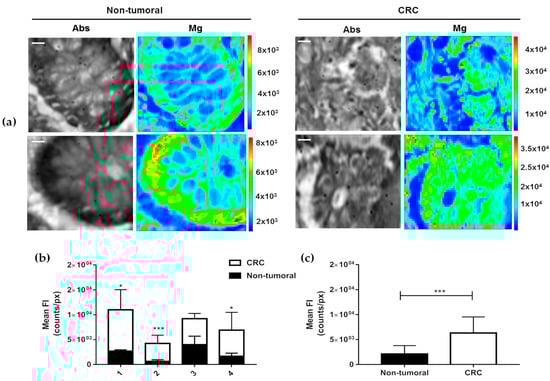 XRFM analysis. (a) Tissue morphology (Abs) and Mg content and distribution of non-tumoural colon epithelium (left panel) and CRC (right panel) tissues. The images shown are representative of the four patients under study; XRFM acquisition time= 6 s/pixel, Incident Energy= 1470 eV. Scale bars are 10 μm. Analysed areas: 78 × 78 μm2 and 78 × 60 μm2. (b) Mean fluorescence intensities of total Mg counts for each patient under study and (c) overall total Mg counts obtained considering all the Mg counts from each patient under study in non-tumoural adjacent and CRC tissues. Total counts were estimated by selecting the overall XRFM analysed areas and normalising the total counts by the size of area itself (pixels). Data are presented as mean ± SD. Non-tumoural (n = 21) and CRC (n = 15). The statistical significance was determined by Students’ t-test. * p-value < 0.05. *** p < 0.001.