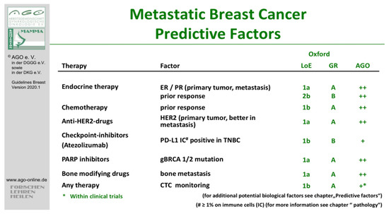 Predictive factors in metastatic breast cancer (mBC), German Gynecological Oncology Group (http://www.ago-online.de assessed on 21 February 2021). (ER = estrogen receptor, PR = progesterone receptor, HER2 = human epidermal growth factor, PD-L1 = programmed death-ligand 1, TNBC = triple-negative breast cancer, PARP = poly (ADP-ribose) polymerase, gBRCA = germline BRCA, CTC = circulating tumor cell, LoE = levels of evidence, GR = grade, AGO = Arbeitsgemeinschaft Gynäkologische Onkologie (German Gynecological Oncology Group).