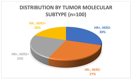 Patient distribution by tumor molecular subtype (by immunohistochemistry (IHC) (n = 100), (HR = hormone receptor, HER2 = human epidermal growth factor).