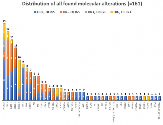 All in all, we detected 161 molecular alterations, with a median of two alterations per sample (range: 0–6). In total, molecular changes in 42 genes were found. As shown in Figure 4, the most common molecular alterations across the sequenced samples were found in the PIK3CA gene (19/100; 19%); followed by TP53 gene (17/100; 17%), and FGFR1 gene (15/100; 15%) (Supplementary Table S1).