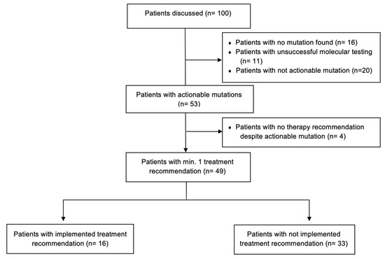 Consort flow diagram showing the results of Molecular Tumor Board (MTB) case discussions based on molecular diagnostics results and implementation of treatment recommendations in our cohort (n = 100).