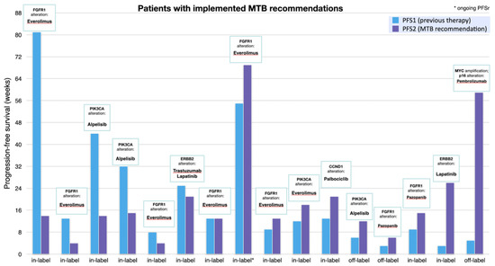 In this study, we demonstrated that individual treatment recommendation based on molecular profiling using NGS could improve PFS of mBC patients. Among those patients with implemented treatment recommendations, more than a half had a PFSr ≥ 1.3, which demonstrates the potential relevance of involving targeted NGS-guided therapies in mBC. Previous studies focusing on implementation of precision oncology in breast cancer care also showed similar results, demonstrating that this approach is feasible and of great importance—at least for a subset of patients [44]. For instance, in the SAFIR01 trial, 9% of the patients with implemented treatment recommendation had an objective response, while 21% responded with stable disease lasting more than 16 weeks [45]. Other recent studies, such as the one by Geelen et al., which accrued 357 breast cancer patients of whom 74% had a potentially actionable alteration, also demonstrated feasibility of using molecular diagnostics to detect actionable molecular alterations. This suggests that clinical utility of genomic profiling in combination with more available targeted therapies will expand over time [46].