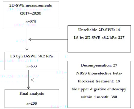 Data were retrospectively collected from 874 subjects who underwent LS measurements by means of 2D-SWE from General Electric between January 2017 and January 2020 in a tertiary gastroenterology center. After applying the exclusion criteria, 208 subjects were included in the final analysis (Figure 1).