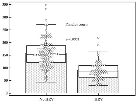 Mean LS values were significantly higher for patients with HRV as compared to those without (14.25 ± 2.12 kPa vs. 11.89 ± 2.39 kPa, p < 0.0001), while the mean platelet count (×109/L) was significantly lower for patients with HRV as compared to those without (91.33 ± 43.38 vs. 158.19 ± 52.15, p < 0.0001) (Figure 2 and Figure 3).