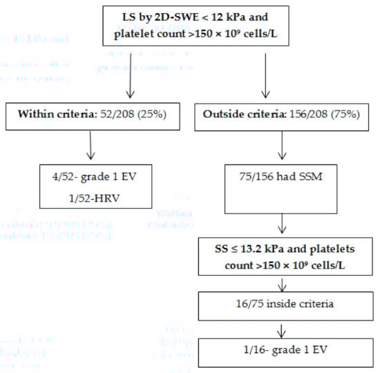 A total of 75/156 subjects that were found to be outside the established criteria (2D-SWE Baveno criteria) had SS measurements performed with 2D-SWE. In order to classify the subjects that did not meet the initial 2D-SWE Baveno VI criteria, a previously established SS cut-off value for predicting HRV together with the same cut-off value for platelets count was used as additional criteria in this subgroup of subjects (SS criteria: (SS ≤ 13.2 kPa and platelet count > 150 × 109 cells/L).