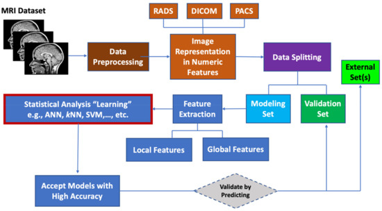 Many machine learning methods require model training with previously labeled MRI data. For generating these models, the data is divided into three sets: training set, test set and an external validation set that is not used in any way for model building. The modeling set (that remains after splitting out the validation set) is split additionally into training and testing (or tuning) sets. If models fail to predict the external validation set, such models are discarded and not used to make predictions. Additionally, other independent validation sets may become available after the completion of the modeling studies, and then can be used as additional validation sets. We have shown earlier that training-set-only modeling is not sufficient to obtain reliable models that are externally predictive [98,99]. Models that are highly predictive on training and testing data should be retained for the majority voting on external validation sets. Finally, only those models shown to be highly predictive on both testing and external validation sets are used as robust classifiers for MRI imaging data.