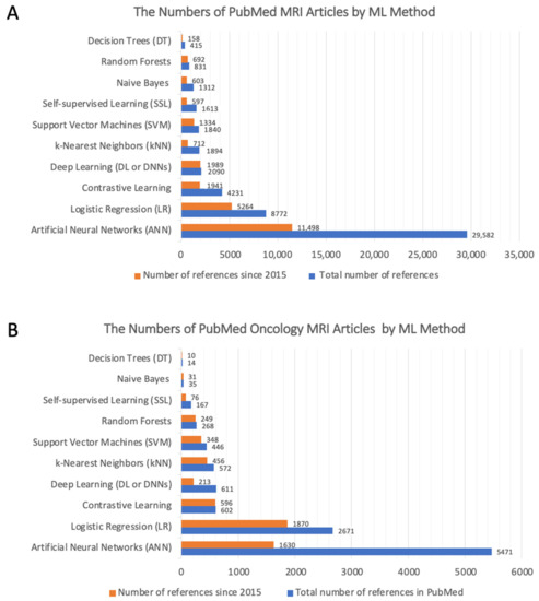 Column chart showing the number of MRI articles based on the ML method used. (A) The total number of PubMed MRI articles based on the applied ML method. (B) The total number of PubMed Oncology MRI articles based on the applied ML method.