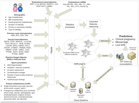 To date, various predictive models using demographic and previous cycle parameters, and the evaluation of either metabolomics or transcriptomics, have been evaluated for optimizing IVF outcome, but separately, thus preventing the necessary desired robust results. We propose a system aiming to overcome the lack of accuracy such systems are currently presented with. This is due to the fact that we will combine personal and lifestyle infertile couples’ data from different European populations with the most commonly used and accessed “omics” (transcriptomics and metabolomics), interpreted and evaluated through modern mathematical techniques, especially ANNs. After the application of statistical models, the system will be capable of distinguishing, among a large number of demographics, clinical and biochemical parameters, those with the greatest significance for predicting the outcome of an upcoming IVF cycle. Thus, a single device integrating both the molecular tests as well as the outcome of the intelligent systems from the previous cycle could be built. The proposed system is expected to combine high accuracy and efficacy, thus leading to cost effectiveness and benefits to the society and economy. Eventually, we expect the evolution of a simple, reproductive and cheap system that could be used in everyday practice in an IVF unit, especially after the large-scale evaluation of metabolomics and transcriptomics, which will decrease test costs, thus making them available for routine use. These improvements are to be universally adopted, as this system is expected to receive a wide acceptance as an innovative managerial tool in fertility centers worldwide and could possibly be established in routine clinical practice for the evaluation and management of infertile patients in the near future.