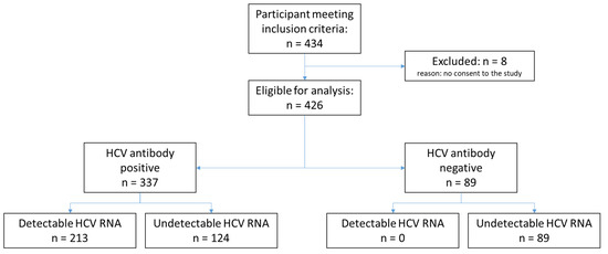 Assuming a sensitivity and specificity of 95% and 97.5%, respectively, a power of 80%, and a significance level of 5%, it was calculated that a minimum sample size of 200 participants with detectable HCV RNA and 200 participants with no detectable HCV RNA was required.
