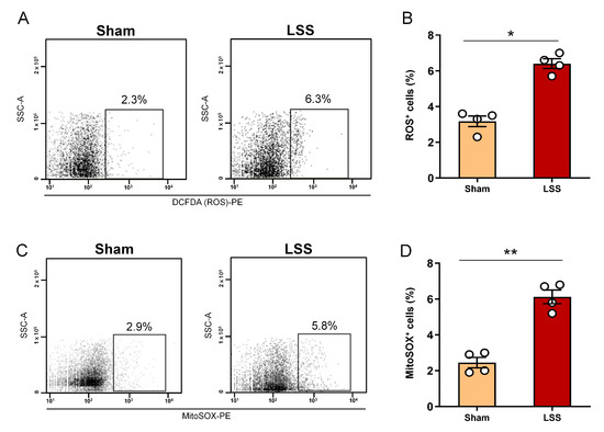 3.4. Analysis of Cellular ROS and Mitochondrial ROS Production within CSF after LSS
