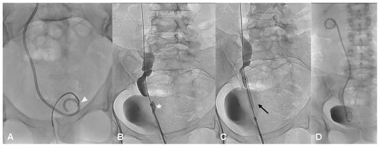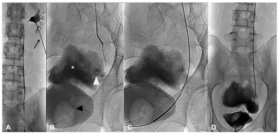 (A–D)—A successful anterograde approach. Right descending pyelography (A,B) performed using a 5 Fr introducer (black arrow) proves a lesion (white arrow head) of the distal third of the right ureter associated with urinoma (white asterisk); the bladder is distended by contrast medium injected through a urinary catheter (black arrow head). (C) A hydrophilic guidewire is advanced in the bladder with a catheter through the ureteral distal stump and a double-J stent (D) was implanted and correctly positioned.