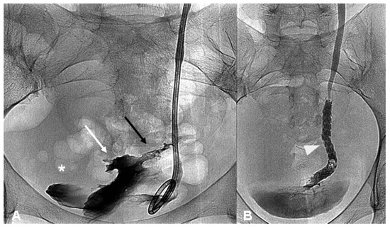 (A,B)—A persistent fistula treated with ureteral stent. Left descending pyelographic study demonstrates a ureterovaginal fistula (black arrow) in the presence of a right DJ stent with opacification of both vaginal lumen (white arrow) and the bladder (asterisk) (A); removable metallic coated stent (white arrow head) is positioned without evidence of a fistula (B).
