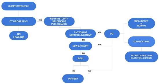 Controversy remains about the ureteral repair strategy regarding surgical or conservative approaches, particularly urological endoscopic or interventional radiology procedures, or both in association (the “rendezvous” technique) [16,23].