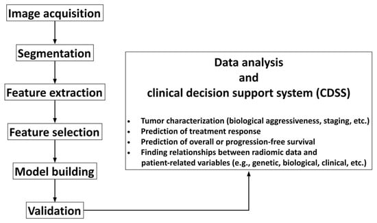 Once tumor segmentation has been carried out, quantitative features must be extracted, which characterize the selected tissue(s). The main features extracted are divided into first-order statistics features, which are derived from gray-level histograms, and second-order statistics features, which are computed from matrices relating each pixel of the image to those in its surroundings, e.g., using gray-level co-occurrence matrices (GLCM) or gray-level run-length matrices (GLRLM). It is essential that those steps be standardized as much as possible to avoid any bias, which may occur due to the inhomogeneity of the source data, especially in the perspective of performing multicentric studies and of future validation for clinical use [].