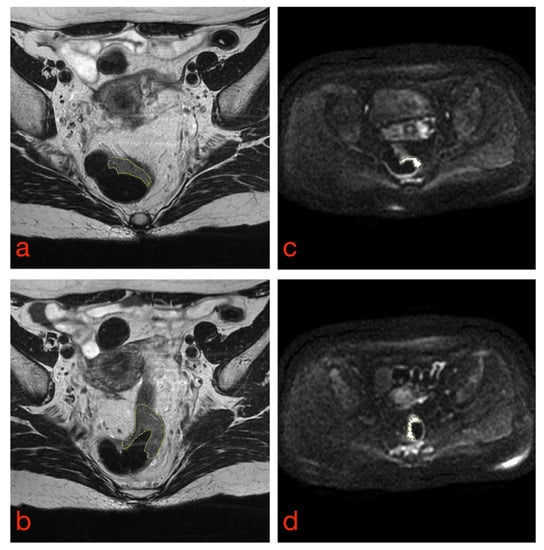 Manual tumor segmentation from T2-weighted (a,b) and DW (c,d) rectal MR images. Tumor borders are highlighted as dashed lines.