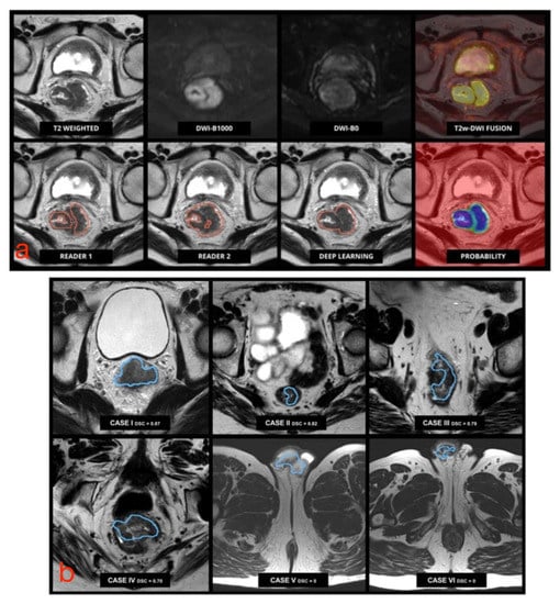 (a) Pretreatment multiparametric rectal MRI examination in a male patient with RC. Upper row (from left to right): axial MR images from T2-weighted images, DWI b1000, DWI b0, and fusion imaging between T2-weighted and DWI b1000 images. Lower row (from left to right): tumor segmentation performed by an experienced reader used for training, an independent reader, the algorithm output, and the corresponding probability map generated by the algorithm. (b) Performance of CNN-based segmentation. The algorithm correctly identified and segmented the tumor in cases I to IV (small field of view), but it failed with a larger field of view images (V and VI), where parts of the cavernous bodies of the penis were mistakenly included in the segmentation. Adapted from [].