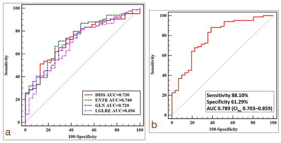 (a) ROC curves of statistically significant texture feature extracted from axial T2-weighted images for predicting the T-stage of RC. (b) ROC curve of a model for predicting T-stage based on multivariate logistic regression analysis. Adapted from [].