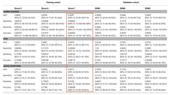 Performance of three predictive models in predicting downstaging, pathological complete response (PCR) and good response in LARC patients. The red box highlights the performance score associated with the highest AUC. Adapted from [].