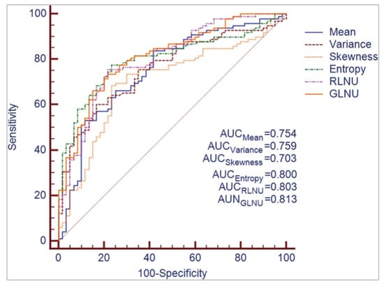 ROC curves corresponding to quantitative texture features derived from T2-weighted MR images for differentiating KRAS mutation status in rectal cancer. Adapted from [].