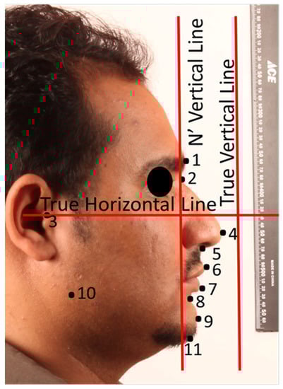The participants were photographed using a precise protocol (Figure 1) []. For that purpose, a professional digital camera (EOS Digital Rebel XT, Canon, Tokyo, Japan) mounted with the same lens (EF 100 mm f/2.8 USM Macro Lens, Canon, Tokyo, Japan) and flash (Macro Ring Lite MR-14EX flash, Canon, Tokyo, Japan) was used in the manual position for all photographic records. A 100-mm macro lens was selected to avoid facial deformations and maintain natural proportions. The right profile photographs were standardized by using a reproducible set-up of a tripod, camera, and chair. Photographs were taken in the natural head position (NHP), with maximum intercuspation and the lips at rest. Glasses and any other obstacles, if necessary, were removed to obtain a clear image of craniofacial area for proper identification of points. A distance of 2.1 m was left between subject and the camera lens and 1 m was left between the subject and the background. The magnification of the image was calibrated using ruler on the anterior and upper side of the subjects. An adjustable mirror holder was used to hold a 35 × 70 cm mirror to allow for proper patient positioning at different heights. Another random set of facial frontal photographs (not standardized) were taken at different distances. The landmarks and reference lines used are presented in (Figure 2).