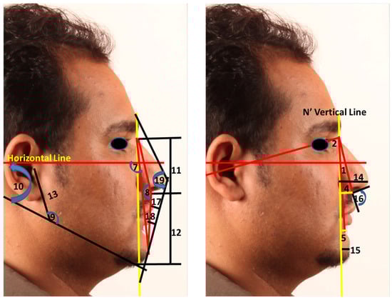 Showing the measurement used in the study as defined in Table 1: (1) Trg N’ .Sn. (°), (2) Trg N’ .B’ (°), (3) the difference between 1 and 2, (4) N’ Vertical Sn (mm), (5) N’ Vertical B’ (mm), (6) the difference between 5 and 6, (7) N’ Pog’/TH (°), (8) N’.Sn.Pog’ (°), (9) Trg. Go’.Me’ (°), (10) TH-MA (°), (11) AFH (N’-Me’) (mm), (12) LAFH (Sn-Me) (mm), (13) PFH (Trg-Go) (mm), (14) Pn-N’ Vertical (mm), (15) Pog’-N Vert (mm), (16) NLA (°), (17) Ls/E line (mm), (18) Li/E line (mm), and (19) Gb.Pn.Pog’ (°).
