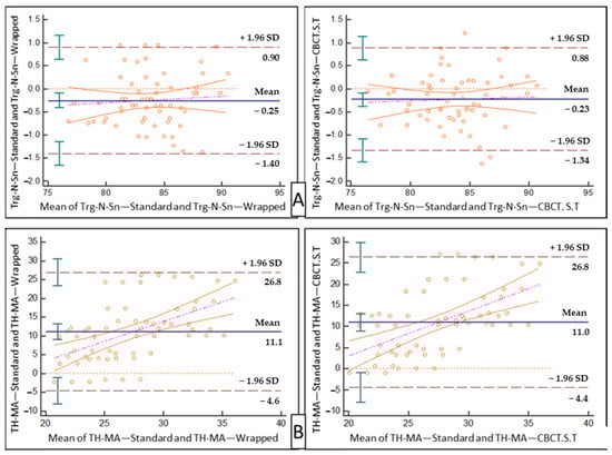 Bland–Altman plots for the “wrapped photograph” and “direct CBCT soft tissue” methods, individually, against the “standard photograph” were drawn for Trg N’. Sn. (°) (Figure 6A), and for TH-MA (°) (Figure 6B).