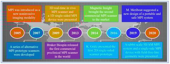 Magnetic particle imaging (MPI) is an emerging non-invasive molecular imaging technology that images the concentration distribution of superparamagnetic iron oxide nanoparticles (SPIONs) []. In 2005, Gleich and Weizenecker of the Philips Research Laboratory first introduced the imaging principle and application prospects of MPI []. In 2007, Conolly and Goodwill developed a series of prototype scanners []. In 2009, Weizenecker announced the 3D MPI scanner for the first time []. In the same year, Sattel presented a 1D single-sided MPI device []. The first 2D prototype of a single-sided scanner was presented by Gräfe []. In 2013, the first commercial preclinical MPI scanner was released by Bruker Biospin. In 2014, Magnetic Insight brought the second commercial MPI scanner []. Five years later, Meribout and Kalra suggested a new design of a portable and safe MPI system []. In 2020, Tuan-Anh Le presented the design of a rabbit scale 3D amplitude modulation MPI system with a bore size of 9 cm []. In the same year, Alexey Tonyushkin at the University of Massachusetts Boston proposed a single-side MPI device with field free-line geometry. Figure 1 shows the timeline of MPI history.