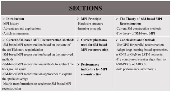 The performance of MPI reconstruction is of enormous practical importance to promote its clinical application, and many studies for MPI reconstruction have been explored and conducted to improve the reconstruction performance. There are mainly two methods of MPI reconstruction: the x-space method and SM-based method. MPI reconstruction based on a system matrix (SM) is an important part of MPI reconstruction approaches. In this review, the principle of MPI and the theory of SM-based MPI are discussed. For SM-based approaches, the reconstruction problem usually comes down to solving a series of linear inverse problems, ill-posed in nature by regularization techniques. Different MPI reconstruction methods based on a system matrix are discussed, including an SM-based MPI reconstruction based on the state-of-the-art Tikhonov regularization, SM-based MPI reconstruction based on the improved methods, SM-based MPI reconstruction methods to subtract the background signal, SM-based MPI reconstruction approaches to expand the spatial coverage, and matrix transformations to accelerate SM-based MPI reconstruction. In addition, the current phantoms and performance indicators used for SM-based reconstruction are listed. Finally, certain research suggestions for MPI reconstruction are proposed, expecting that this review will provide a certain reference for researchers in MPI reconstruction and will promote the future applications of MPI in clinical medicine. Figure 2 shows the organization of this work.