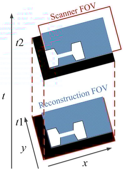 To avoid the interruption of the image acquisition process, Straub and Schulz studied the joint MPI reconstruction method of the tracer distribution and background []. Based on the high time resolution of MPI, they assumed that the tracer distribution and background of the two consecutive images are almost the same, and the FOV shifts between the consecutive images are introduced to realize the separation of the background signal and the tracer signal. The scanner FOV can be moved between two consecutive images by superimposing a uniform magnetic field (such as the focus field). The two-dimensional joint image reconstruction method is shown in Figure 4, and the time series of image acquisition are displayed vertically. The FOVs (marked in red) of the scanner at t1 and t2 move one voxel in the spatial direction, and the FOV used for the reconstruction is the superposition of two FOVs (marked in blue).